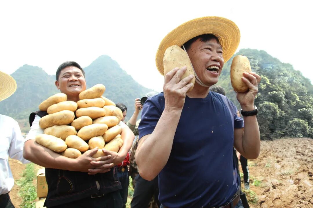 朱有勇院士(右一)拿着刚刚挖出的“比脸还大”的新鲜土豆,朝着镜头展示。