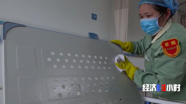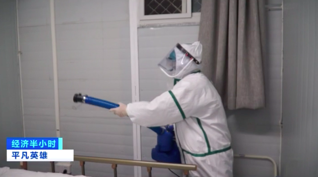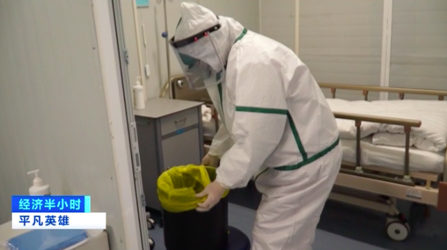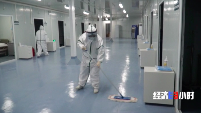 在301医院里,他们需要穿着防护服,戴着口罩、护目镜这些笨重的防护装备,打扫擦拭医院里的每一个角落,还要负责清运医疗垃圾,每个人每次要连续工作6个小时。