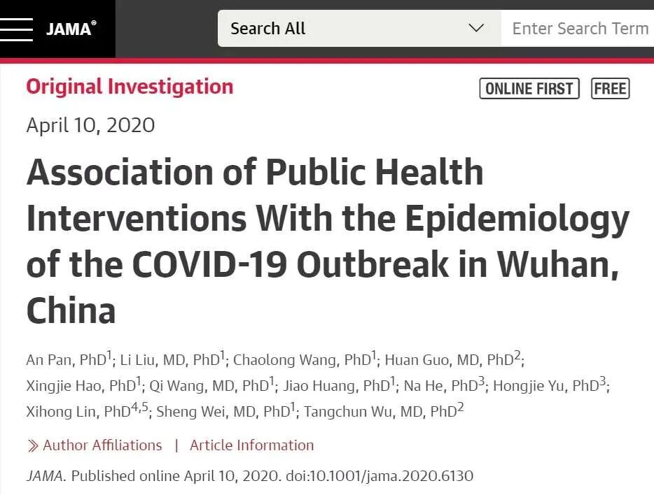 著名医学期刊JAMA杂志(《美国医学会杂志》)近日在线刊发了华中科技大学同济医学院科研团队领衔的研究论文“Association of public health interventions with the epidemiology of the COVID-19 outbreak in Wuhan, China”(《武汉市COVID-19暴发流行与公共卫生干预的关系》)。