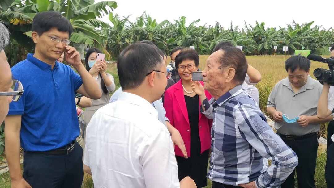 袁隆平院士在湖南杂交水稻研究中心耐盐碱水稻三亚实验基地现场观测指导。湖南杂交水稻研究中心研究员杨耀松 摄