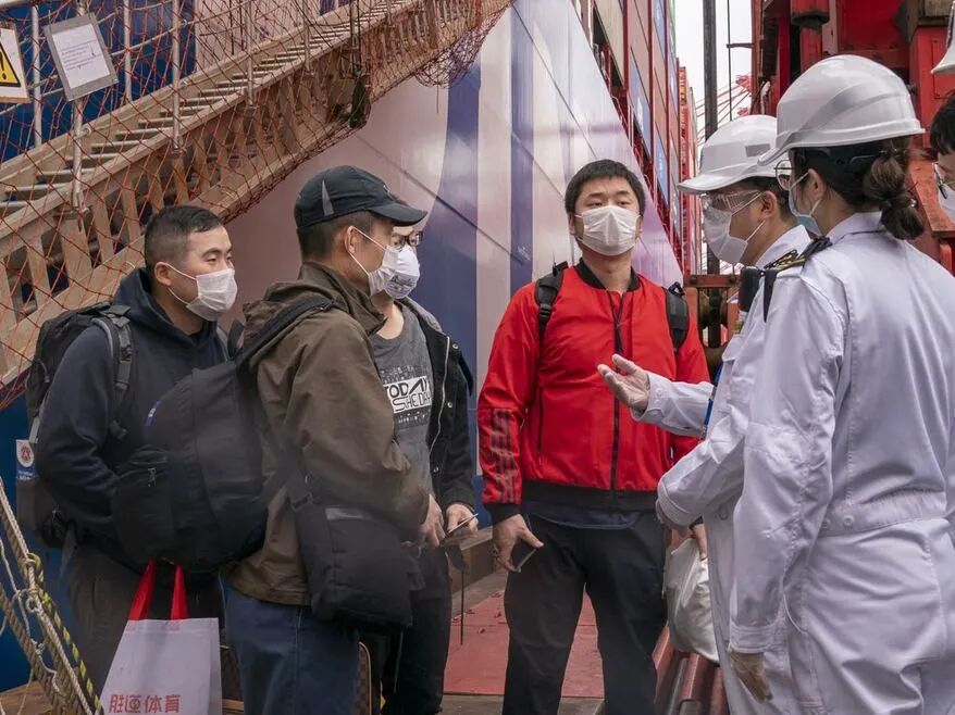 国际航行船舶船员入境上岸换班,上海海事执法人员宣贯防疫及隔离注意事项。