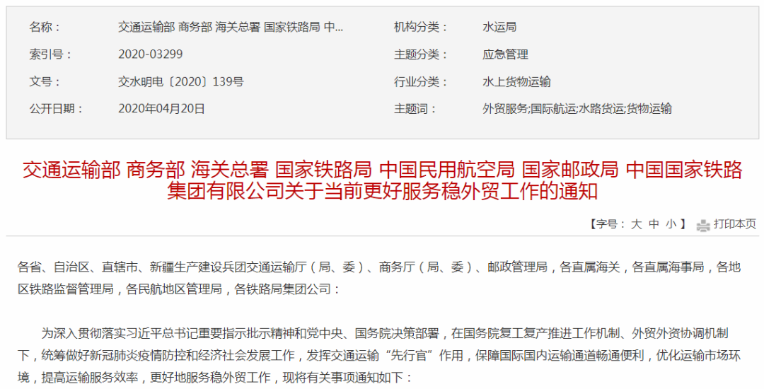 4月20日,交通运输部、商务部、海关总署、国家铁路局、中国民用航空局、国家邮政局、中国国家铁路集团有限公司联合印发关于当前更好服务稳外贸工作的通知,充分发挥国务院复工复产推进工作机制国际物流工作专班的作用,全力以赴保障国际国内运输通道畅通便利,优化运输市场环境,提高运输服务效率,促进我国出口货物出得去、进口货物进得来。