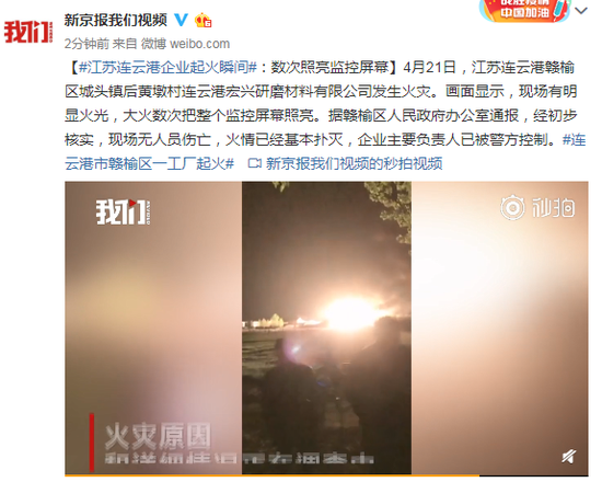 4月21日,江苏连云港赣榆区城头镇后黄墩村连云港宏兴研磨材料有限公司发生火灾。画面显示,现场有明显火光,大火数次把整个监控屏幕照亮。据赣榆区人民政府办公室通报,经初步核实,现场无人员伤亡,火情已经基本扑灭,企业主要负责人已被警方控制。