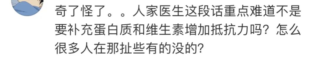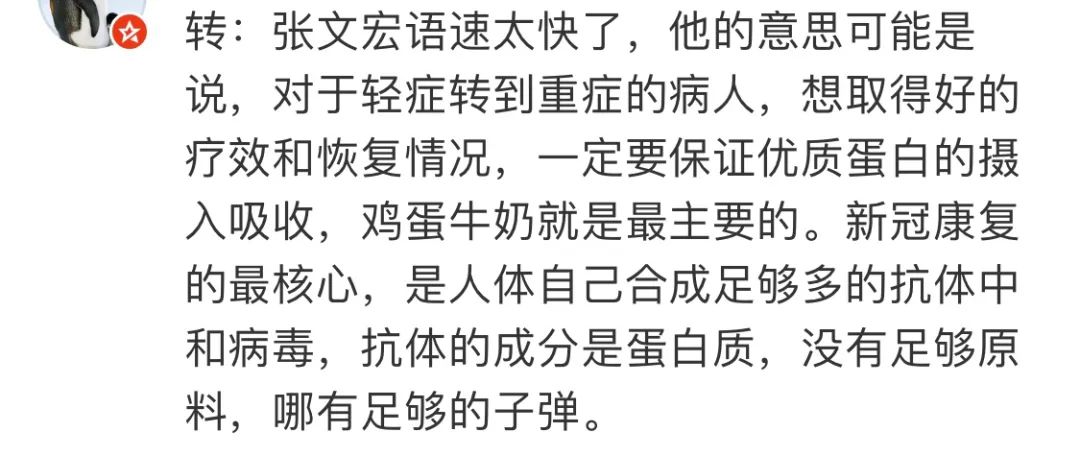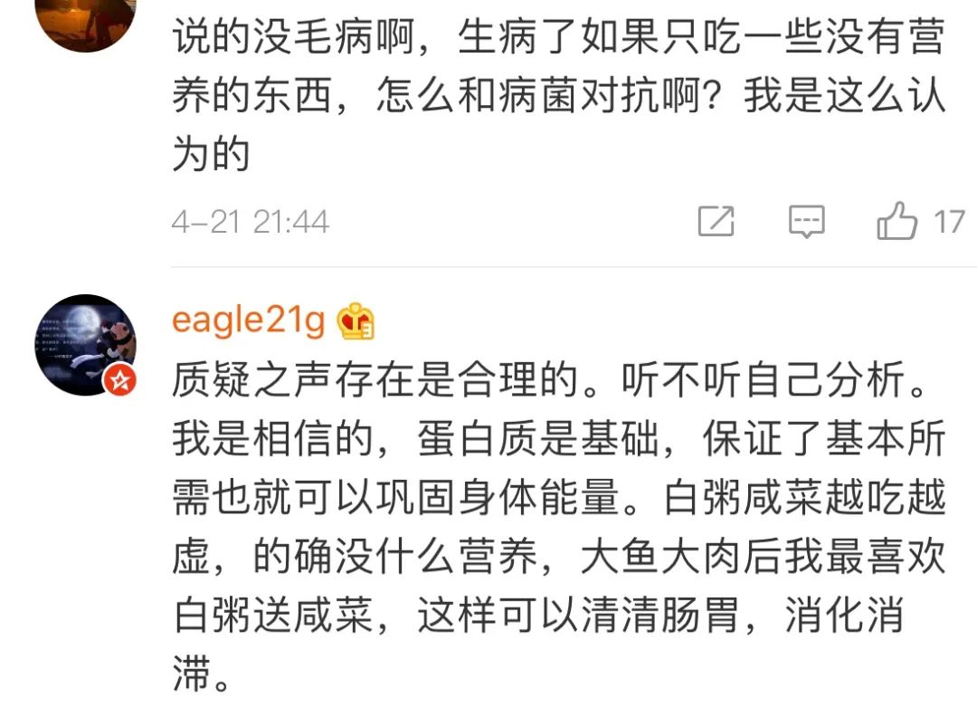 他认为重症转轻症最主要的一点要保证营养和蛋白质,这时候,靠粥和咸菜你就麻烦了。而且,中国人最喜欢喝鱼汤了,鱼渣也要吃掉,都是蛋白质。