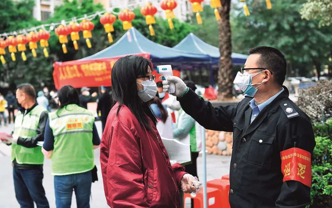 2月6日,广东省广州市白云区黄石街道白云尚城社区的工作人员对进入社区的人进行体温测量。摄影/新华社记者 卢汉欣 3月10日,习近平总书记赴湖北省武汉市考察疫情防控工作,看望慰问奋战在一线的医务工作者、解放军指战员、社区工作者、公安干警、基层干部、下沉干部、志愿者和居民群众。他强调:“抗击疫情有两个阵地,一个是医院救死扶伤阵地,一个是社区防控阵地。” 新冠肺炎疫情发生以来,基层社区是联防联控、群防群控的主战场,也是疫情防控的第一道关口。