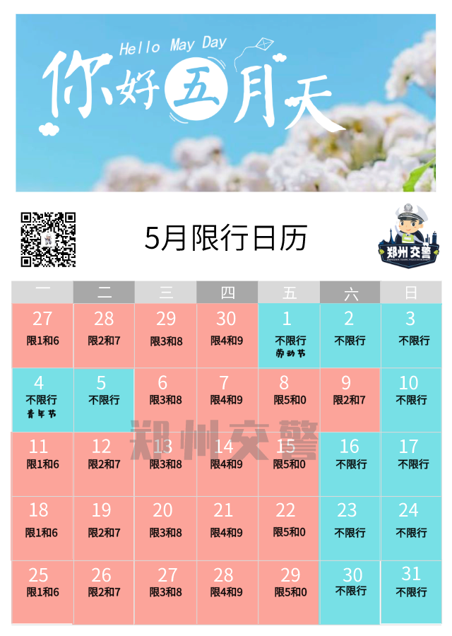 有出行计划的小伙伴注意啦! 4月26日(周日)是工作日 尾号1和6的车辆限行 除此之外 小编还准备了一份出行锦囊 拿好不谢! 假期出行指南 今年五一连休5天,是大小长假政策实施多年来的首次: 5月1日(周五)—5月5日(周二)放假调休,共5天。 根据《郑州市人民政府机动车限行规定》要求,(因法定节假日放假调休而调整为上班的周六、周日,按对应调休的工作日限行) 4月26日(周日)尾号1和6限行 5月9日(周六),尾号2和7限行 ▼附5月限行日历 5月1日(周五):上午8时至12时郑州周边各个高速公路上下站口将出现较大车流量,郑州周边景点、公园,市内各个大型商超、饭店将出现较大人流量。 5月2日(周六)、5月3日(周日)、5月4日(周一):郑州周边景点、公园、商场等处继续保持较大人流量,但市内各条道路交通流量会有所下降且平稳。 5月5日(周二):是五一小长假的最后一天,下午16时至20时,各条高速公路的站口将出现较大的返程高峰,提醒大家错峰返回。 5月6日(周三)是五一小长假之后第一个工作日,当天机动车尾号限行3和8。 ①出行前记得提前规划路线,留意天气变化; ②带好各类证件(身份证、驾驶证、行驶证),及时处理违法,按时年审; ③出行前对车做一个全方位的检查,除了检查刹车片、火花塞、电瓶、雨刷器等,还要重点检查: 轮胎:气温不断升高,是车辆爆胎的高发期,爆胎会直接导致交通事故,造成不可估量的后果。定期检查轮胎、躲避尖锐障碍、避免暴晒,防患于未然! 油液:定期更换车辆油液,让汽车处于健康的状态,有效延长爱车的使用寿命 杀菌消毒:疫情期间也要给爱车做好防护,及时清洗水箱及滤芯、定期更换空调滤芯,能有效防止爱车“过敏”。 大家外出要遵守交通规则 注意行车安全哟! 来源: 河南交通广播