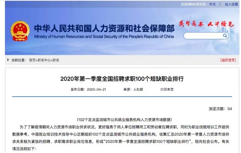 近日,人社部公布 “2020年第一季度全国招聘求职100个短缺职业排行”。