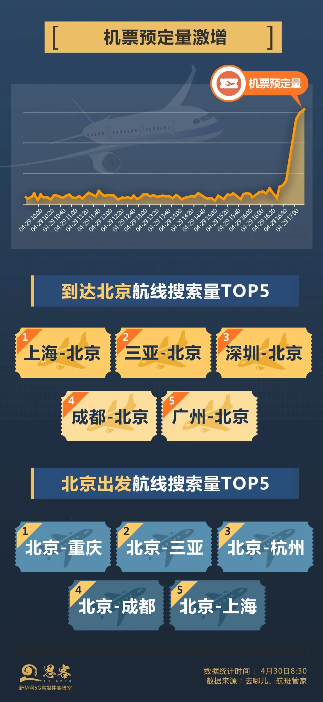 3倍、5倍、15倍……机票酒店景区预订量涨涨涨!去哪儿网数据显示,消息发布后的半小时内,北京出发机票预订量较上一时段暴涨15倍,度假、酒店等其他旅游产品搜索量上涨3倍。飞猪数据显示,北京进出港机票成交量比前一天同时段增长超500%,进出北京火车票成交量增400%。航班管家数据显示,北京进出港航线搜索量激增,其中北京飞往重庆、三亚、杭州的航线和从上海、三亚、深圳飞往北京的航线搜索量最大。