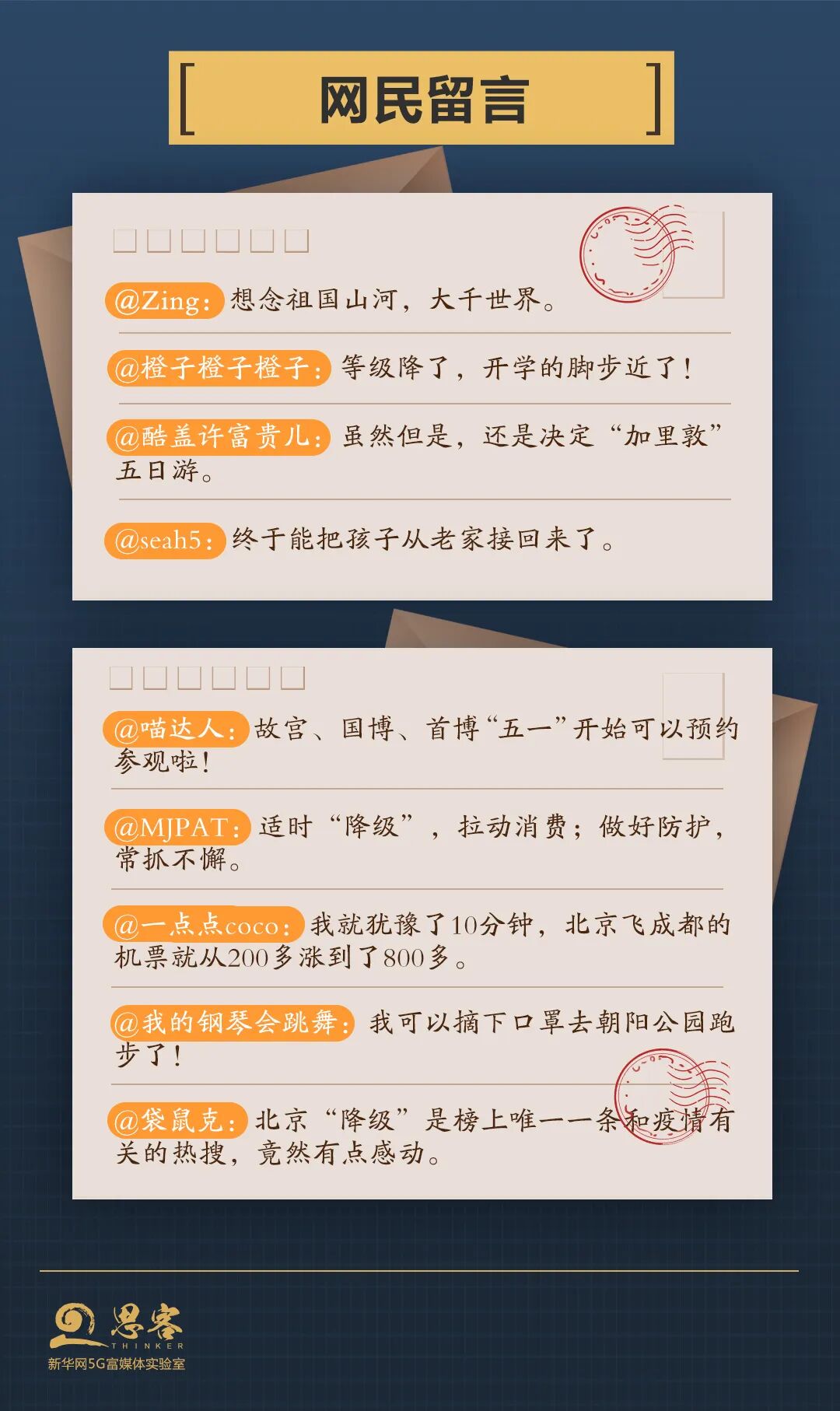 下调应急响应等级不仅让“五一”假期的出游人群有了更多选择,也便利了不少需要进出北京出差、探亲的人们。有关人员进出防控措施的话题最受网民关注,不少网民评论说,“回北京不用隔离啦”“五一可以不用异地恋了” “终于可以出差了”“终于能把爸妈和孩子从老家接来了”。
