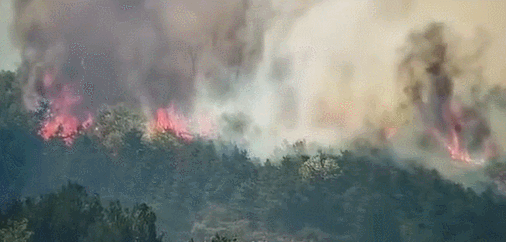 森林中,只见这大火是在猛烈燃烧,烟雾直冲云霄,现场有人员正在疏散,组织灭火。