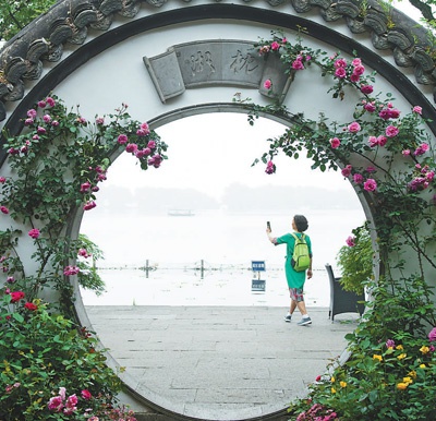 图为5月5日,游客在西湖畔的郭庄观赏风景。