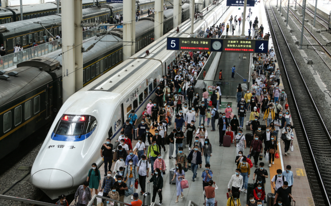 ↑5月5日,旅客在江西南昌站有序出站。