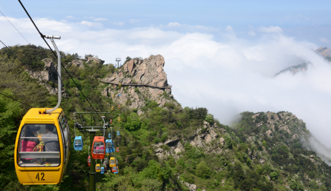 ↑5月5日,游客乘坐索道在位于山东省临沂市平邑县的蒙山龟蒙景区游览。(图片来源:新华社)
