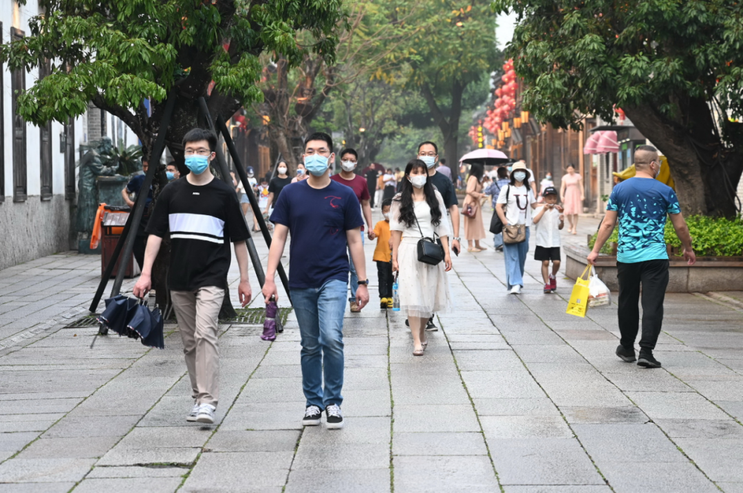 ↑5月5日,游客在福州三坊七巷游玩。(图片来源:新华社)