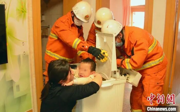 3月13日15时许,山西省介休市一名男孩被困于洗衣机甩干桶内,消防员通过扩张甩干桶方才解救出被困孩子。 王志浩 摄