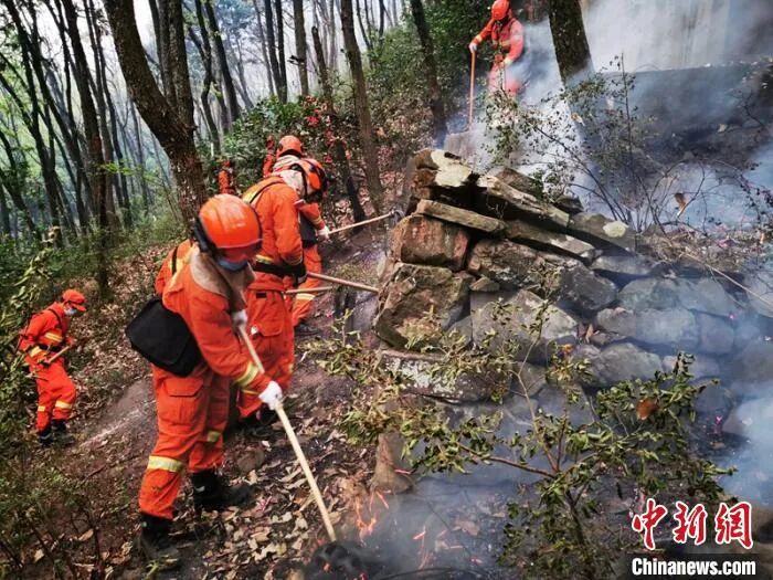 森林消防员在林间清理烟点。 曾鹏 摄