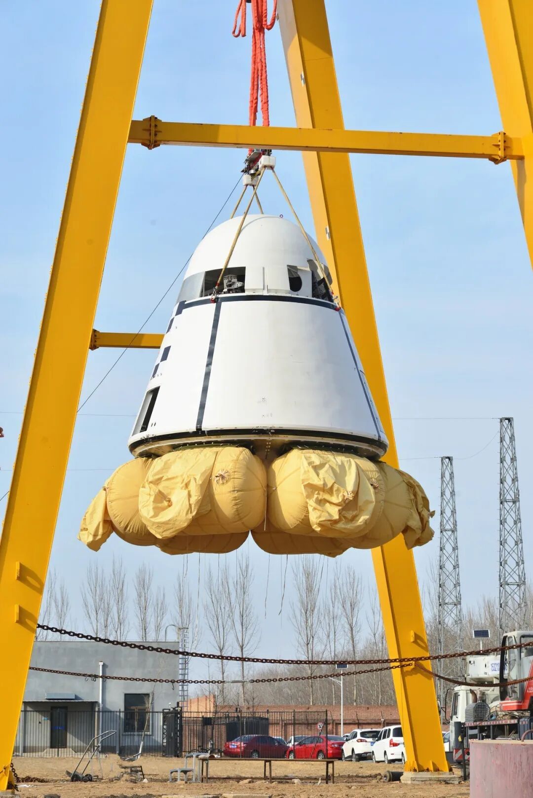 返回舱落地时,当然不能硬邦邦地砸下来。试验船底部安装了6个气囊,帮助舱体平稳软着陆。