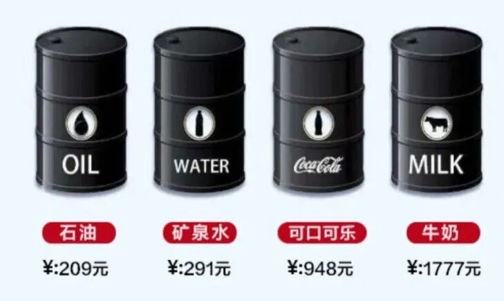 有人将油价与水价做对比,发现一桶原油按30美元计折合人民币约209元,同样容量的矿泉水售价却接近300元。