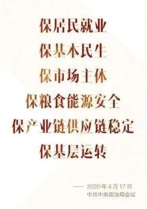 首次提出“六保”,即保居民就业、保基本民生、保市场主体、保粮食能源安全、保产业链供应链稳定、保基层运转。