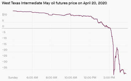 截至4月20日收盘,5月美国轻质原油期货(WTI)价格暴跌约300%,收于每桶-37.63美元。