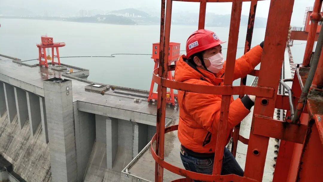 4月30日,艳阳高照,三峡升船机检修现场,戴着口罩的李然坚守在承船箱的弦梯上,观察着优化施工情况。