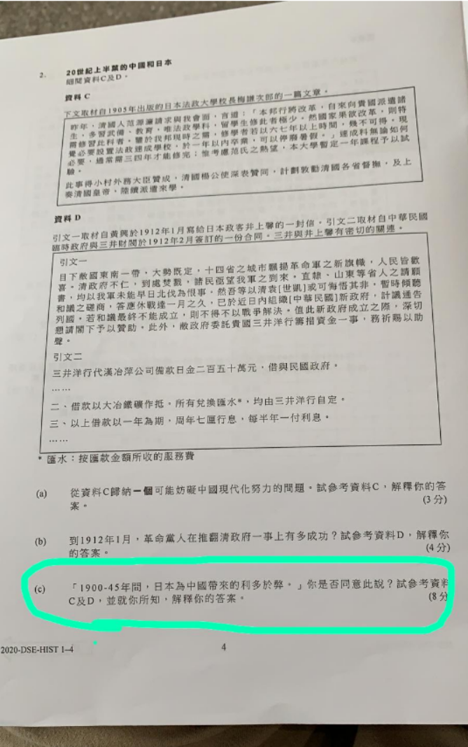 香港教联会还提到,无独有偶,在今日文凭试历史科的试卷,其中一题竟问到考生是否同意“1900-1945年间,日本为中国带来的利多于弊”的陈述。难免令人怀疑杨颖宇作为考评局评核发展部经理(历史科),其政治立场已影响了试题的设置。