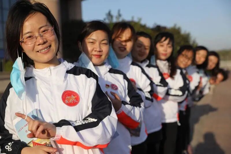 4月5日,山东省返鲁援鄂医疗队中的青年队员们在结束隔离休整、完成相关健康检测后,来到户外阳光下,摘掉口罩,拍照留念。卢鹏 摄