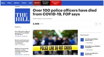 “警察兄弟会在疫情伊始时便知,抗击这一疫情(指新冠)的一线执法人员——其中90%以上将由地方和州机构派出——将越来越容易感染上病毒。新冠病毒(的传播)不分年龄、种族和性别。” 警察兄弟会在一份声明中说,“正如我们所担心的,新冠病毒已夺去许多人的生命,现在包括越来越多的执法人员。”