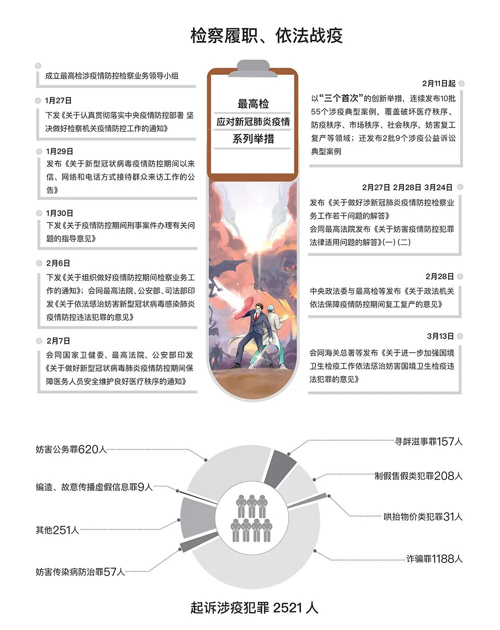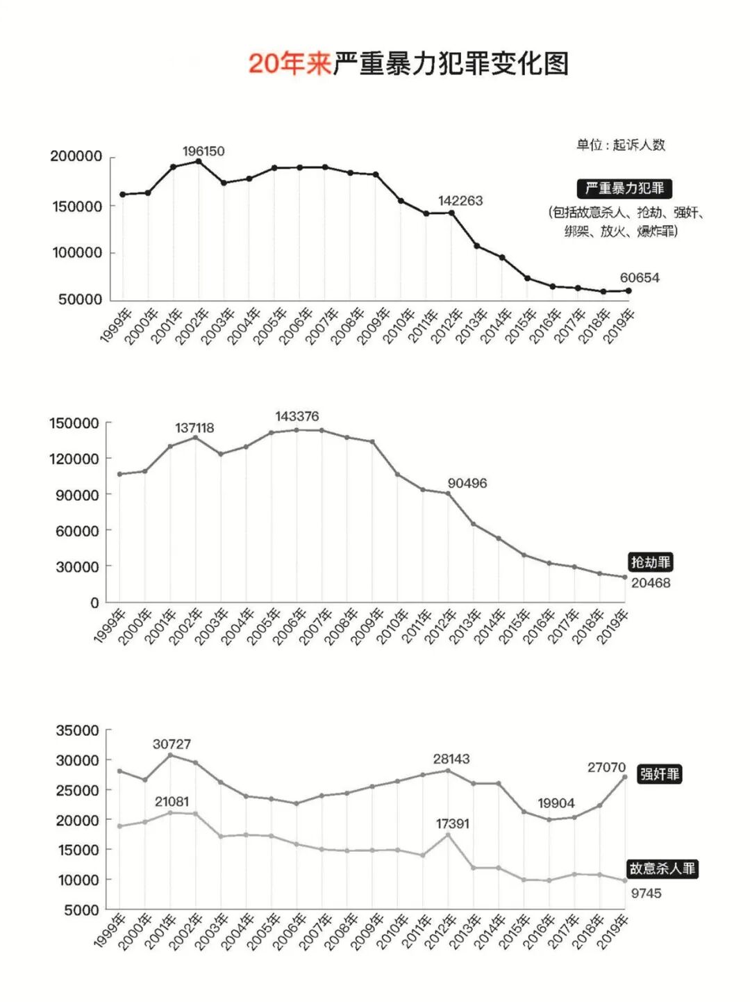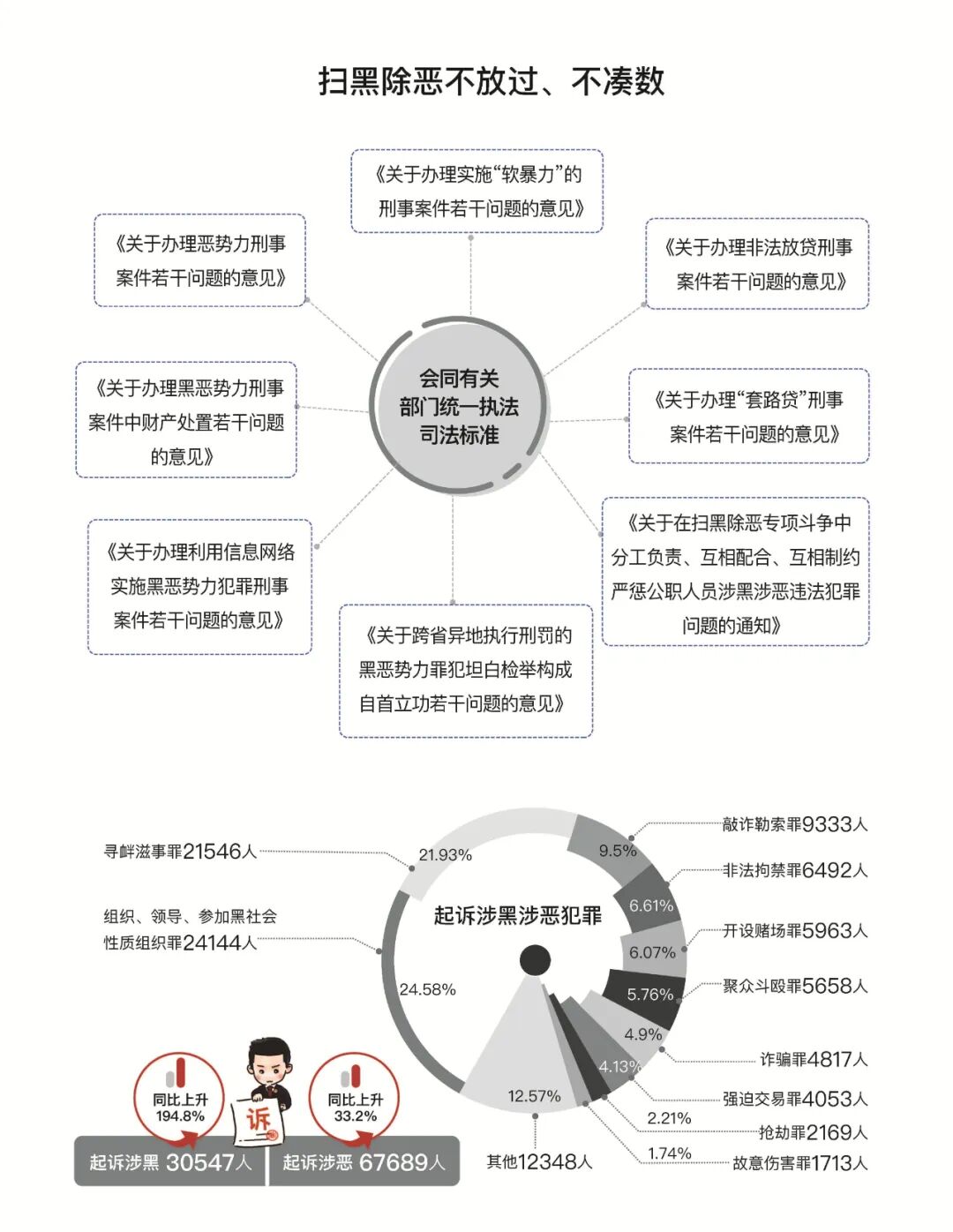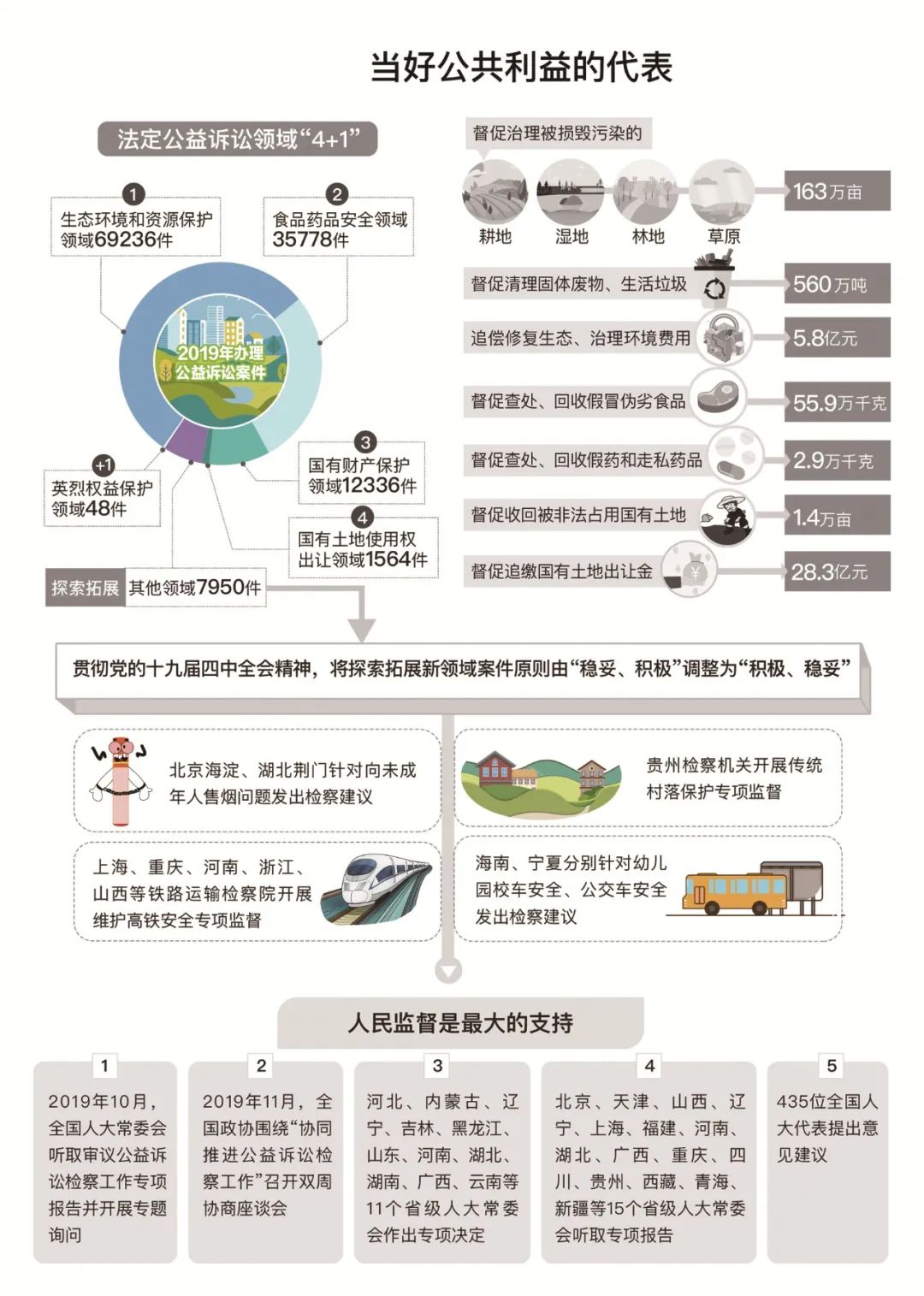 最高人民检察院工作报告 ——2020年5月25日在第十三届全国人民 代表大会第三次会议上 最高人民检察院检察长 张 军 各位代表: 现在,我代表最高人民检察院,向大会报告工作,请予审议,并请全国政协各位委员提出意见。 去年以来,在以习近平同志为核心的党中央坚强领导下,在全国人大及其常委会有力监督下,最高人民检察院坚持以习近平新时代中国特色社会主义思想为指导,全面贯彻党的十九大和十九届二中、三中、四中全会精神,认真落实十三届全国人大二次会议决议,紧紧围绕统筹推进“五位一体”总体布局、协调推进“四个全面”战略布局,把增强“四个意识”、坚定“四个自信”、做到“两个维护”体现在履职尽责上,把庆祝新中国成立70周年、开展主题教育和开展新冠肺炎疫情防控斗争迸发出来的激情转化为守初心、担使命的扎实行动,讲政治、顾大局、谋发展、重自强,各项检察工作取得新进展。 检察履职战疫情况 最高人民检察院坚决贯彻习近平总书记重要指示和党中央决策部署,带领各级检察机关主动服务疫情防控大局,在依法战疫中守初心、担使命。2020年2月至4月,共批准逮捕涉疫刑事犯罪3751人、起诉2521人,办理涉口罩等防护物资监管、医疗废弃物处置、野生动物保护等领域公益诉讼案件2829件。一是迅速出台办案规范。疫情突如其来,依法防控更显重要。为适应办案需要,最高人民检察院1月30日出台专门规范。其后,会同相关政法部门发布指导意见,依法惩治危害疫情防控犯罪;与国家卫健委等作出部署,对伤医扰医犯罪一律从严追诉;与海关总署等共同规范惩治妨害国境卫生检疫犯罪,严防疫情境外输入性风险;与相关领导机关、政法部门共同发布指导意见,助力复工复产,促进加快恢复经济社会秩序。二是创新以案释法。应对重大突发公共卫生事件不能按部就班。自2月11日起,最高人民检察院首次以在办的批捕起诉案件释法,首次会同公安部发布典型案例,首次以每周一批的频次,根据疫情防控不同阶段特点,分专题发布10批55个典型案例,突出维护医疗秩序、防疫秩序、市场秩序、社会秩序,收到规范司法、警示犯罪、教育社会的积极效果。三是保障涉案人合法权益。从一开始就注意准确把握法律政策,力防突破法律的“从重”“从严”“从快”。犯罪嫌疑人是确诊或疑似患者的,首先保障救治,体现司法人文关怀。对情节轻微的涉疫犯罪落实从宽政策,依法不批捕576人、不起诉117人。在这场严峻斗争中,各地特别是湖北检察机关闻令而动,坚持自身防疫与依法履职两手抓,下沉社区参与一线联防联控,以法与情写就中国抗疫故事检察篇章。经历这次大考,我们更加深刻感受到中国共产党领导和我国社会主义制度的显著优势,更加深刻体会到法治在国家治理中的重要作用。 2019年工作回顾 2019年,全国检察机关紧紧围绕党和国家工作大局,忠实履行宪法法律赋予的法律监督职责。全年共办理各类案件3146292件,同比上升9.7%。其中,审查逮捕案件935432件,审查起诉案件1413742件,刑事、民事、行政申诉案件258520件,公益诉讼案件126912件,诉讼活动违法监督案件411686件。 一、积极参与、促进国家治理,为经济社会发展大局服务 全力投入平安中国、法治中国建设,在推动依法治理中守初心、担使命。批准逮捕各类犯罪嫌疑人1088490人、提起公诉1818808人,同比分别上升3%和7.4%。 坚决维护国家政治安全和社会稳定。贯彻总体国家安全观,依法严惩分裂国家、间谍等犯罪。支持新疆等地检察机关健全反恐维稳常态机制。坚决惩治“法轮功”等邪教组织犯罪。严惩严重暴力犯罪,起诉60654人,同比上升1.6%。依法惩治盗窃等多发性侵财犯罪,起诉393587人,同比上升5.1%。突出惩治重大责任事故等安全生产领域犯罪,起诉3543人,同比上升5.9%。加大惩治电信网络诈骗以及利用网络赌博、泄露个人信息等犯罪力度,起诉71765人,同比上升33.3%,网络空间不容犯罪藏身。 严格依法推进扫黑除恶专项斗争。会同有关部门制定8个指导性文件,对107起重大案件直接挂牌督办,派出专家组督导孙小果案、杜少平操场埋尸案、黄鸿发家族案等重大案件。共起诉涉黑犯罪30547人、涉恶犯罪67689人,同比分别上升194.8%和33.2%。坚持“是黑恶犯罪一个不放过、不是黑恶犯罪一个不凑数”,省级检察院对涉黑和重大涉恶案件统一把关。侦查机关以涉黑涉恶移送审查起诉,检察机关依法不认定9007件;未以涉黑涉恶移送的,依法认定2148件。促进深挖根治,起诉“保护伞”1385人,同比上升295.7%。 扎实服务打好三大攻坚战。为金融安全护航。起诉金融诈骗、破坏金融管理秩序犯罪40178人,同比上升25.3%。最高人民检察院向中央有关部门发出第三号检察建议,推动强化监管、源头防控。为脱贫攻坚助力。起诉扶贫领域“蝇贪”877人,向扶贫款物伸手必严惩。向因案致贫返贫的6000个受害家庭发放司法救助金7589万元,同比分别上升42.4%和54.7%。盯住拖欠农民工工资问题,起诉恶意欠薪犯罪902人,支持农民工起诉10322件。为美丽中国添彩。对污染环境、走私洋垃圾、非法采矿等犯罪从严惩处,起诉50800人,同比上升20.4%。办理生态环境领域公益诉讼案件69236件,同比上升16.7%。山西浑源32家采矿企业私挖滥采,最高人民检察院挂牌督办,省委和省政府重视、支持,三级检察院联动,以公益诉讼推动生态治理4万余亩。 更实