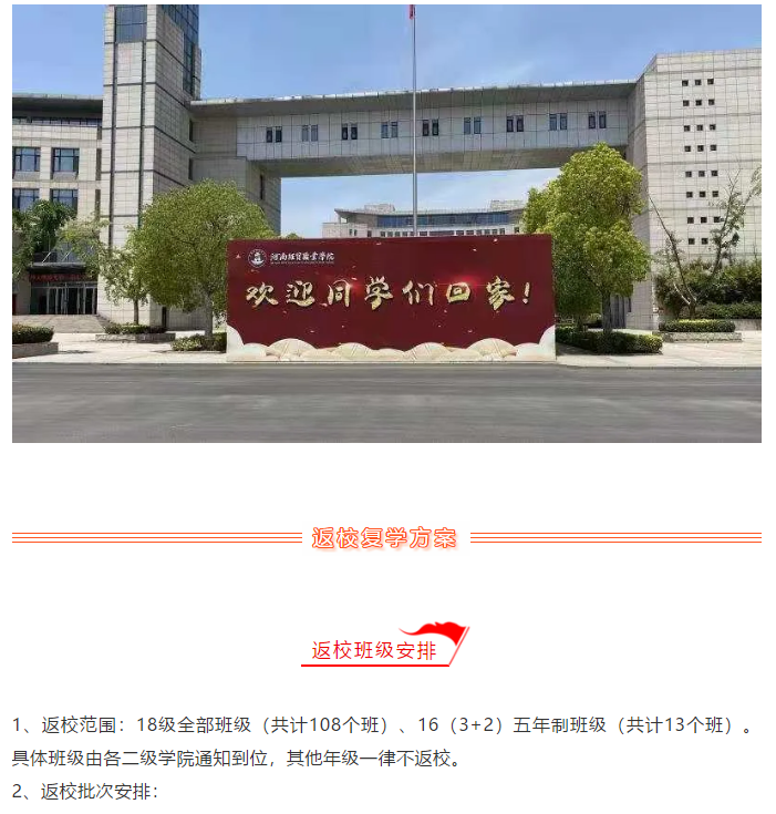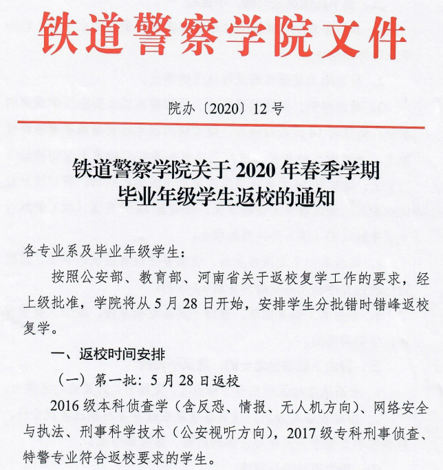 按照公安部、教育部、河南省关于返校复学工作的要求,经上级批准,学院将从5月28日开始,安排学生分批错时错峰返校复学。