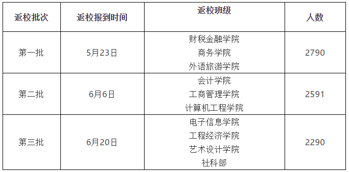 二、首批返校复学对象为需要补上实验实训课程的部分学生和符合返校条件的本专科毕业生。具体返校批次、返校时间和有关要求由学务处和各住宿书院通知到每位学生。请同学们按照规定时间返校,不得提前。