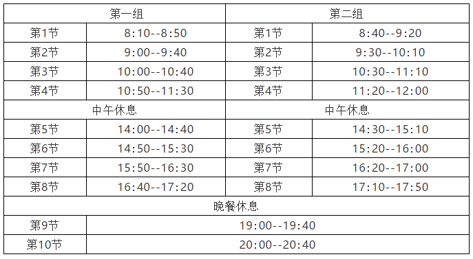 (2)分组上课安排:所有班级分时段上下课,上课时间按每天10节课安排。具体班级的分组情况,到校后由二级学院通知。