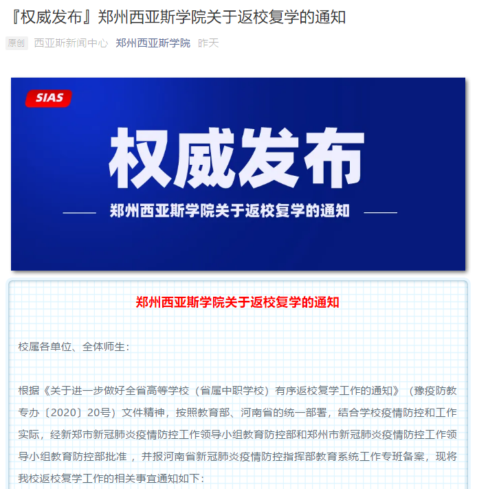 根据《关于进一步做好全省高等学校(省属中职学校)有序返校复学工作的通知》(豫疫防教专办〔2020〕20号)文件精神,按照教育部、河南省的统一部署,结合学校疫情防控和工作实际,经新郑市新冠肺炎疫情防控工作领导小组教育防控部和郑州市新冠肺炎疫情防控工作领导小组教育防控部批准 ,并报河南省新冠肺炎疫情防控指挥部教育系统工作专班备案,现将我校返校复学工作的相关事宜通知如下: