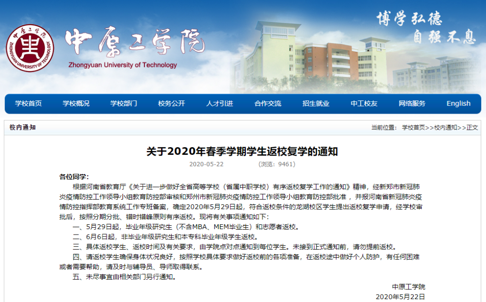 按照教育部、河南省、郑州市关于返校复学工作的要求和安排,结合学校实际情况,我校定于自2020年5月28日起,按照分期分批、错时错峰和自愿的原则,安排符合返校条件的学生有序返校。现将有关事项通知如下: