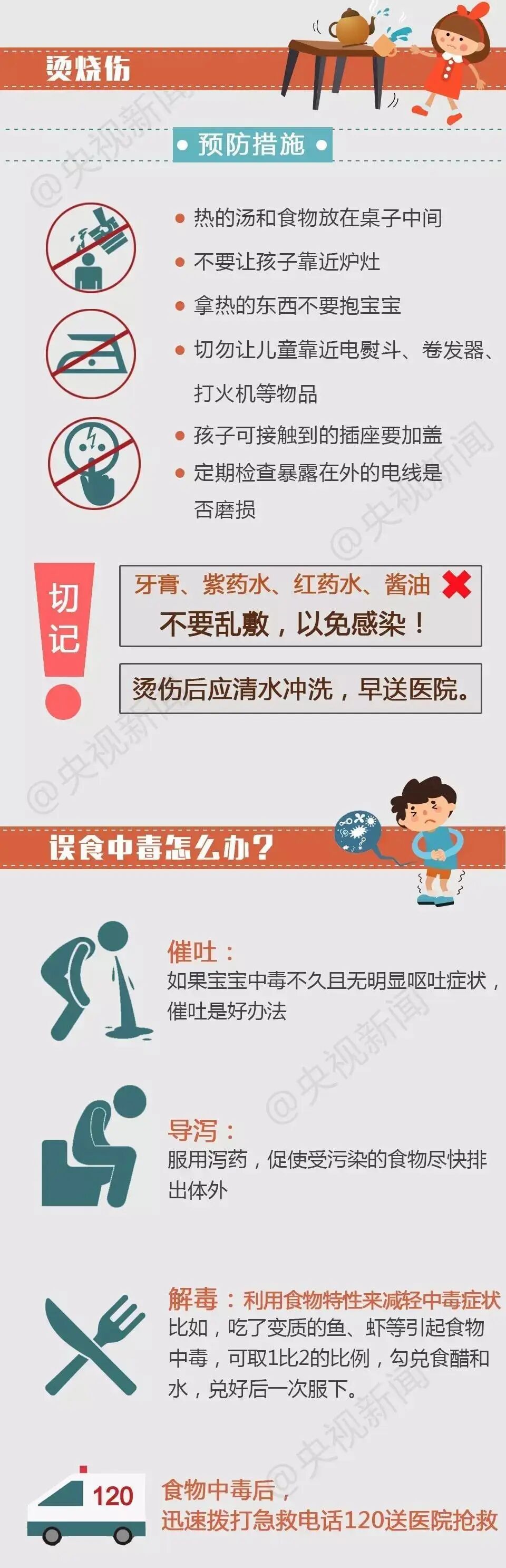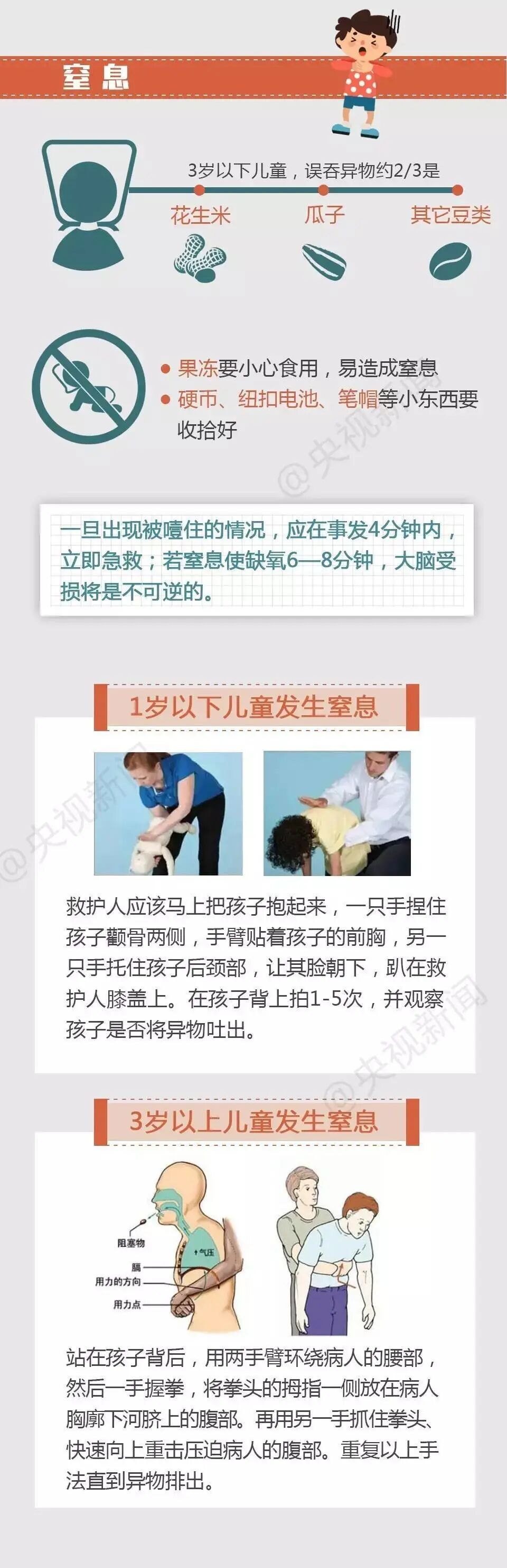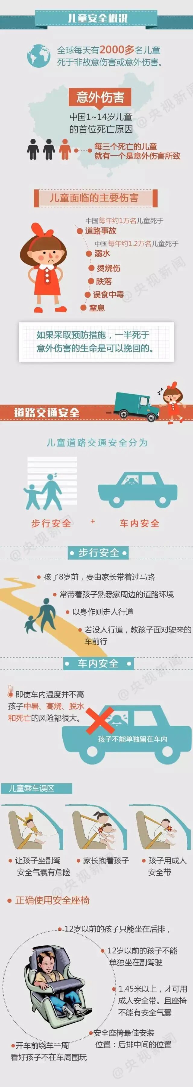 (图源:央视新闻) 除了以上六大儿童安全隐患外,还有这些儿童出行的安全隐患—— 1.倒车盲区 身材矮小的儿童处于车身附近位置时,很容易进入驾驶员的视觉盲区,进入车辆盲区的儿童很难被驾驶员发现。 2.车窗、天窗 孩子把头探出窗外,一旦遇到车辆往来密切或车外无法预料的状况,往往来不及反应,很容易发生意外。因此,家长一定要叮嘱孩子,不要把手或头伸出窗外。 3.车门安全锁 儿童安全锁是为了防止儿童在行车中突然打开车门而设置的,避免儿童无意中打开车门造成的危险。带孩子乘车时一定要注意开启儿童安全锁。 4.安全带、安全座椅 汽车上的安全带是按成人标准来设计的,不适合儿童体型。如果给孩子使用成人的安全带,绑得太紧,在发生碰撞时会造成致命的腰部挤伤或脖子、脸颊的压伤;绑得太松,发生车辆碰撞,儿童可能会从安全带和座椅之间的空隙中飞出去。因此,正确做法是使用儿童安全座椅。 5. 孩子锁在车内 不要单独把孩子锁在车内,这样很容易造成孩子中暑,甚至死亡。 6.孩子坐前排 抱着孩子坐在副驾驶位置或者让孩子单独坐在副驾驶位置是相当危险的。一旦出现急刹车或者发生碰撞时,孩子就会往前冲撞向中控台或者前挡风玻璃。安全气囊也会对儿童构成危险,气囊弹出的冲击力相当于炸弹,足以导致儿童骨折甚至死亡。 7.骑车上路年龄 年满12周岁,才可以骑自行车上道路;上道路骑行时,不要与汽车抢行。 更多骑车安全注意事项戳下面视频: 8.戴安全头盔 如果是父母骑电动车送孩子上学,父母和孩子都要戴上安全头盔。 一、拐卖儿童常见的四大骗术 ●假冒熟人:“我是你妈的朋友王阿姨呀,她有事来不了,让我接你回家”等等。 ●物质诱惑:犯罪分子用糖果、玩具、电子设备来诱拐小孩。 ●盗窃抢劫:趁着大人看管不严,将孩子偷走或者拐走。 ●利用善心:有些骗子利用孩子的单纯善良,采用让他们带路的方式进行拐骗。 二、拐骗儿童的高发地 ●购物场所:由于商场、市场等购物场所的空间大、人群密集,家长有时忙于挑选购物,容易忽视身边的孩子,给拐骗者有可乘之机。 ●车站:带孩子出门在火车站或长途汽车站遇到“好心人”,一定要心存戒备。拐骗者往往是一些看起来和蔼可亲、易接近的形象,会让人放松警惕,在家长带孩子需要帮忙的时候,他们就会伸出“黑手”。 ●游乐场所:家长需要格外警惕,因为这些场所流动人员多、场地开阔、身心易放松、视线易分散,有些拐骗者会利用同龄孩子以一起玩耍为借口,进行拐骗。 ●住宅小区:小区里遇上攀谈的人,忽略了孩子,或是有预谋地和家长接触一段时间,等产生信任后,伺机把孩子拐骗走。 ●餐厅里面:餐厅里人多杂乱,空间狭窄,会给拐骗者留下机会。 三、孩子们可以怎么保护自己? ●不要和陌生人说话:孩子思想单纯,对任何人都没有戒备心,平时要告诉孩子不要和陌生人说话,不要轻信不熟悉的人。如果一个陌生人说他需要帮助,可以告诉孩子让他去找大人帮助。 ●不接受陌生人礼物:拐骗者往往利用一些小诱惑来吸引孩子,达到拐骗的目的,所以父母要特别教育孩子,拒绝接受陌生人的物品,学会抵抗诱惑,即使是曾经见过的人,也不要轻信。 ●教孩子进行反拐骗练习:平时父母要尽量通过游戏和情景模拟对孩子进行教育,结合身边的事例进行教导,增强孩子的自我防范意识。