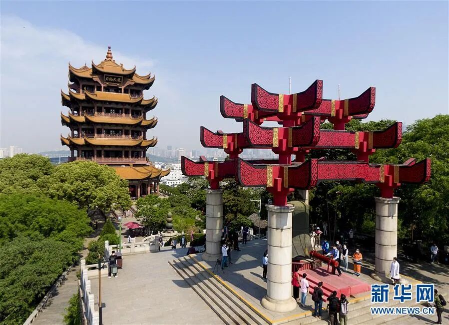 4月29日,抗疫一线代表在武汉黄鹤楼景区重新开放仪式上撞钟祈福。目前,景区不提供窗口售票,游客通过网络实名预约购票。黄鹤楼主楼部分开放,每半小时允许300名游客进入。目前,景区不提供窗口售票,游客通过网络实名预约购票。