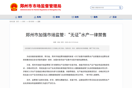 记者了解到,6月15日,郑州市市场监督管理局发布了《郑州市加强市场监管:“无证”水产一律禁售》的通知,该通知强调即日起,郑州市场监管局根据河南省《关于加强市场销售水产品质量安全监管全面排查整治食品安全风险的通知》要求,加强对食用农产品集中交易市场的监督检查。