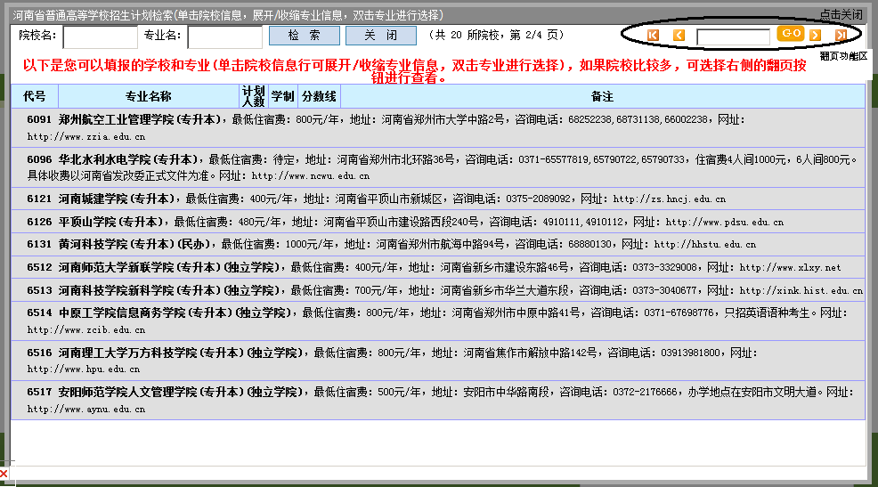 专升本和对口生可以手动输入院校代号和专业代号,同时也可以点击院校和专业输入框后面的“选择院校”和“选择专业”按钮,使用计划查询功能。如果信息比较多,请使用翻页功能或者输入页码直接跳转到相应的页。