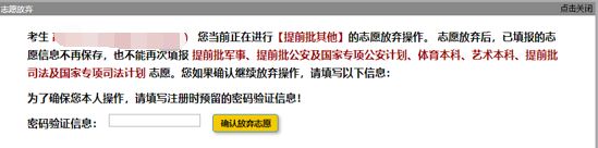 当考生点击放弃志愿后,短信服务平台(10639639)会为报名阶段验证过的短信服务手机号码发送验证码短信,考生需要输入验证码进行验证。