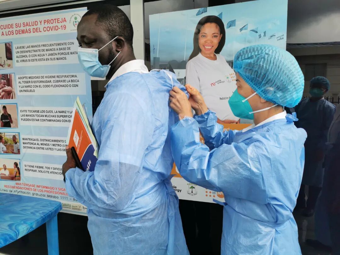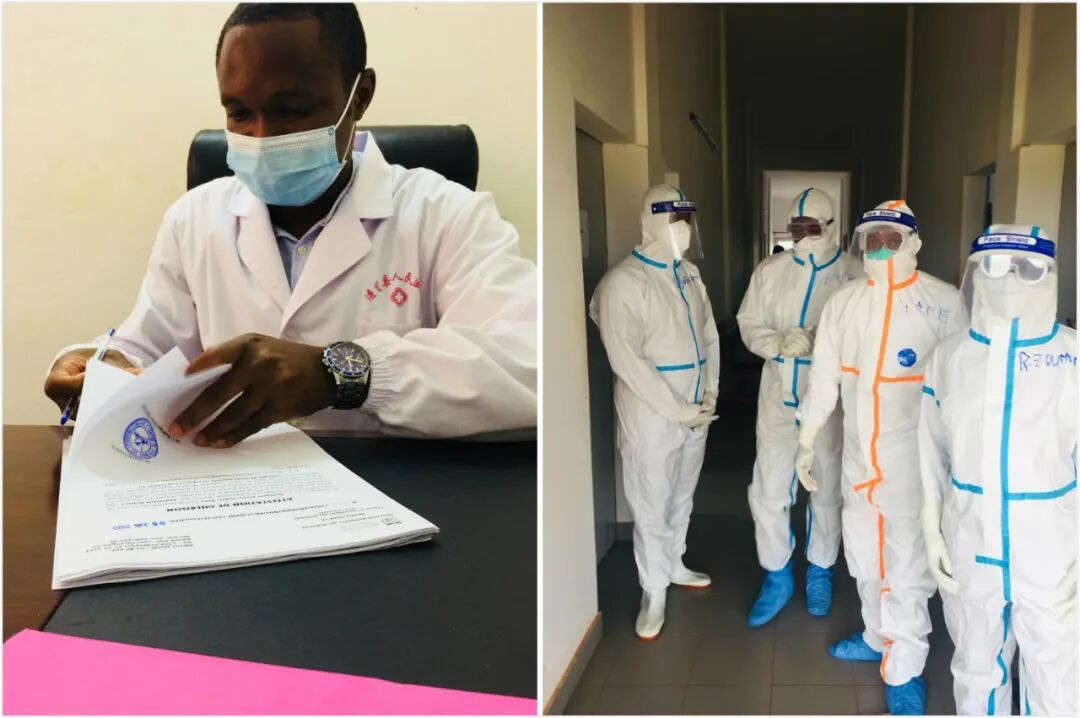 ▲左图:6月16日,在贝宁一家医院,莱东瀚正在工作。右图:6月16日,在贝宁一家医院,莱东瀚(右二)和其他医护人员穿着采用中国标准的防护服。新华社发