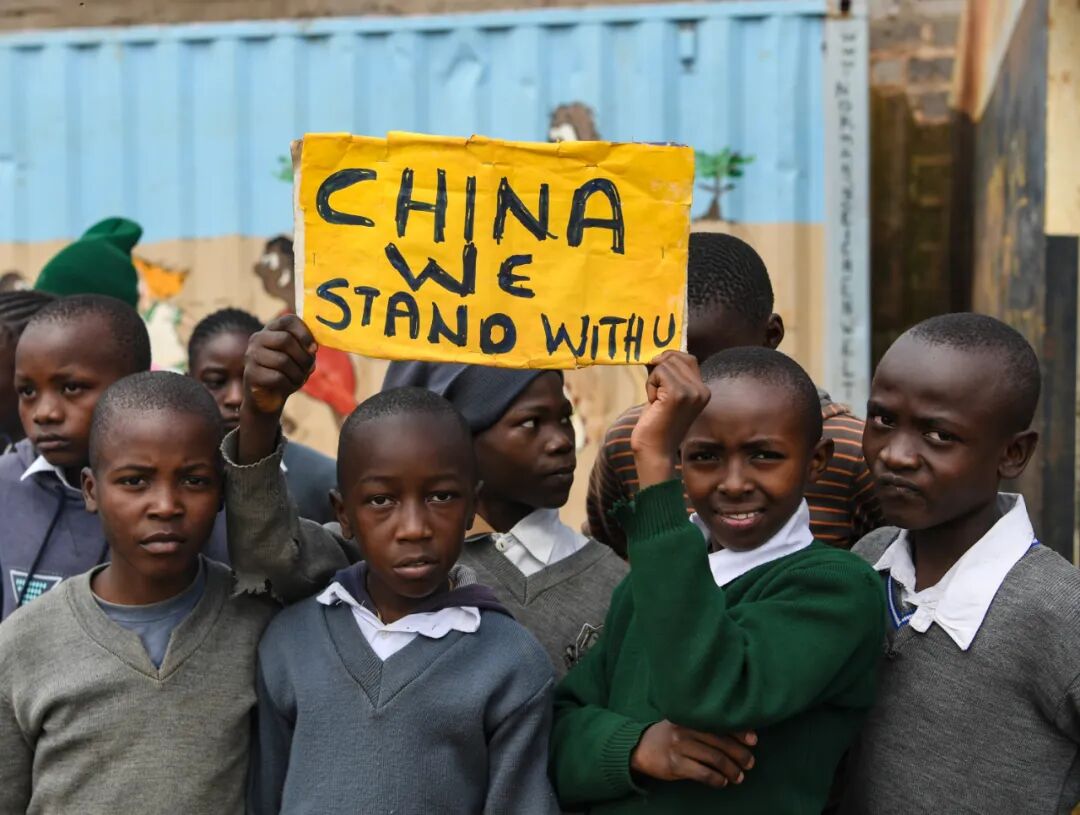 ▲2月19日,在肯尼亚内罗毕,马萨雷贫民窟的小学生展示标语牌,表达对中国的关心和祝福。标语牌上写着:中国,我们和你在一起。新华社记者 李琰 摄