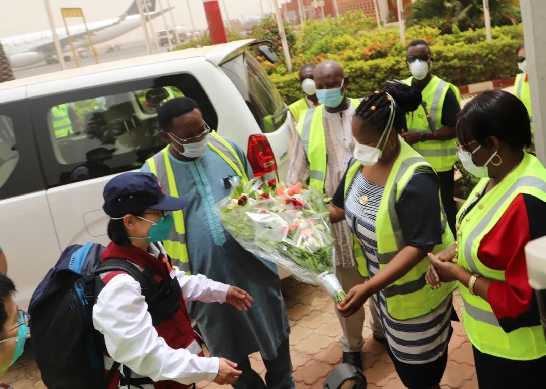 ▲4月16日,在布基纳法索首都瓦加杜古,布方代表欢迎中国政府派遣的抗疫医疗专家组专家。新华社发