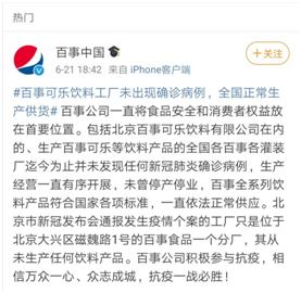 对于百事可乐是否也被牵涉其中。百事中国6月21日傍晚,在官方微博发布澄清消息,百事可乐饮料工厂未出现确诊病例,全国正常生产供货。