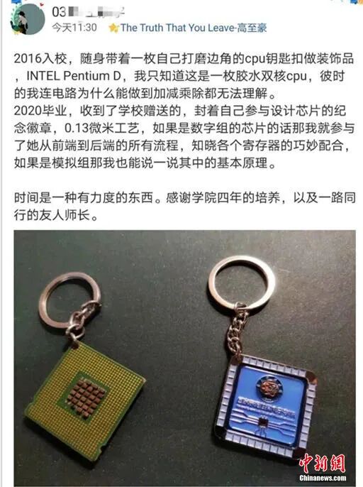 最近,即将毕业的电子科技大学示范性微电子学院首届本科生在学院办公室领取毕业证和学位证的时候发现,除了学历和学位证书,学院还精心为每位同学准备了一份特殊的礼物——一个嵌入了一枚芯片的钥匙扣。