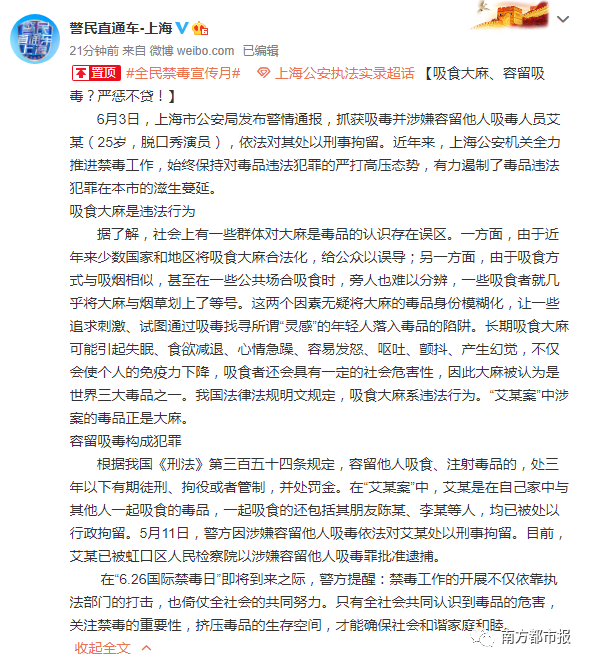据@警民直通车-上海:6月3日,上海市公安局发布警情通报,抓获吸毒并涉嫌容留他人吸毒人员艾某(25岁,脱口秀演员),依法对其处以刑事拘留。