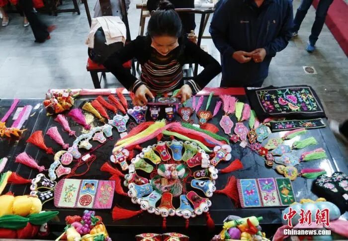 资料图:为迎接端午节的到来,青海省平安驿举办海东市首届河湟香包比赛,共有来自互助、循化、平安、乐都等6个地区的1500余件样式精美、造型独特的手工香包作品亮相。中新社记者 马铭言 摄