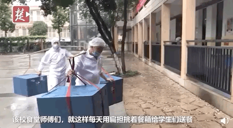 武汉高三复课后 同学们怎么吃饭成了问题 武汉第十四中学食堂师傅 每天挑扁担给学生送餐 中午一次、晚上一次 每次每个人跑4趟 一根扁担、两个箱子、过百斤的午餐 师生们都亲切称他们为“挑山工”