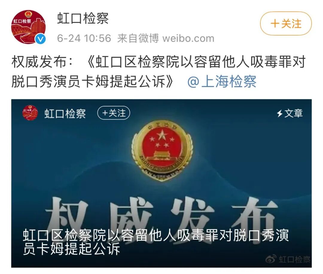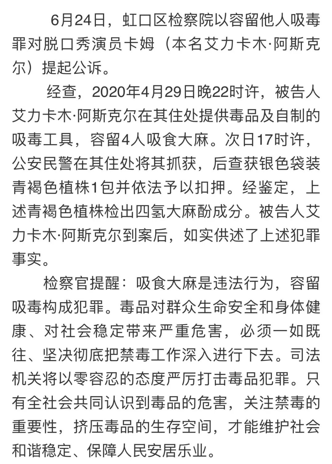 7月20日,上海虹口区人民法院公开开庭审理脱口秀演员卡姆(本名艾力卡木·阿斯克尔)容留他人吸毒一案,法院判处被告人艾力卡木·阿斯克尔有期徒刑8个月,并处罚金2000元。