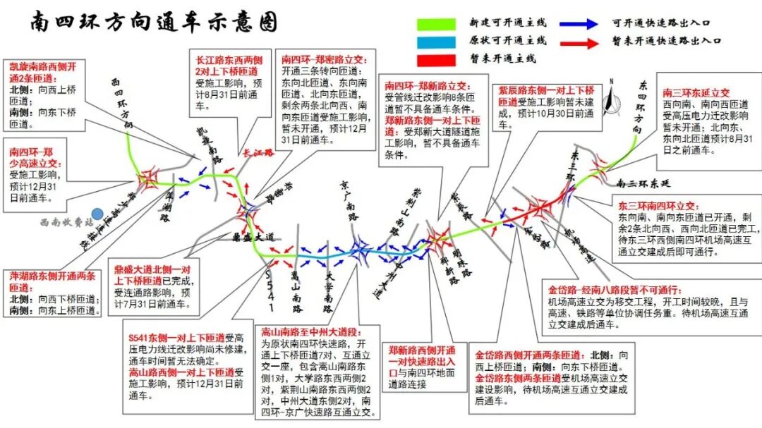 据了解,此次试通车段共计71.9公里。此前,西四环陇海路-莲花街段12公里已建成通车,南四环嵩山路-中州大道段5.4公里为原状南四环快速路,南四环金岱路-经南八路段4公里内机场高速互通立交为移交工程,开工时间较晚,且与高速、铁路等单位协调任务重,暂不具备开通条件。