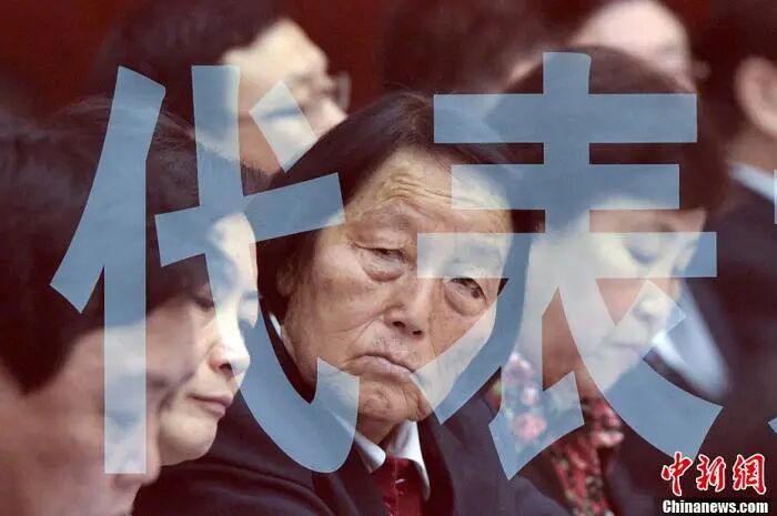 资料图:2013年3月7日,全国人大山西代表团举行全体会议,审议政府工作报告,并对媒体开放。图为申纪兰在团组讨论中。(双重曝光图)中新社发 韦亮 摄